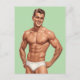 This striking illustration captures a single, smiling male figure with an aura of confident, retro charm. The artistic style is a homage to the polished, highly rendered aesthetic of mid-century pin-up and magazine illustration, characterized by smooth gradients and a vibrant, almost luminous quality. The figure's chiseled physique and immaculate, slicked-back hair embody an idealized image of youthful health and vigor. His hands-on-hips pose and engaging smile convey a sense of playful self-assurance and charisma. The focus on the figure, isolated against a simple background, emphasizes the artistry of the form and the expressive character of the portrait. This piece is a celebration of classic graphic art and confident masculinity, making it an uplifting and visually crisp choice for those who appreciate the iconic style of vintage illustration.