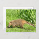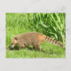 Coati sudamericana, o Coati de cola anillada (Nasua nasua) vista desde su perfil sobre hierba