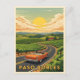 Un clásico convertible naranja pasea por una carretera bordeada de viñedos y árboles, bajo un cielo de puesta de sol vibrante.