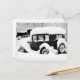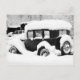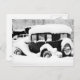 Fotografía en blanco y negro de un coche vintage en la nieve.