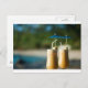 Cócteles tropicales para dos servidos en vasos altos con pajitas junto a la orilla del mar, profundidad de campo superficial y espacio para copiar