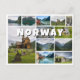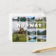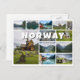 Postal de collage de fotos de Noruega con hermosas montañas y paisajes fiordos, como el fiordo de Geiranger y iglesias con el texto 'Noruega' en blanco.