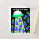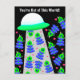 Colorida y divertida tarjeta postal de San Valentín perfecta para la escuela de primaria o un amigo. Múltiples extraterrestres y corazones flotando desde una nave espacial. "¡Estás fuera de este mundo!" "Feliz Día de San Valentín" por la espalda.