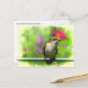 Esta postal contiene un joven colibrí gaviota que aún no ha desarrollado la coloración rubí en su garganta. Está sentado en una barra metalizado, listo para sumergirse en el néctar de las flores que lo rodean. El fondo es una agradable paleta de color rosa, rojo, dorado, amarillo y verde.