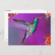 Tarjeta animal que muestra un hermoso néctar de flores de colibrí azul-verde. Los colibríes son aves del Nuevo Mundo que constituyen la familia Trochilidae. Se encuentran entre los pájaros más pequeños. Se les conoce como colibríes por el sonido del zumbido creado por sus alas golpeadoras que se aletean a altas frecuencias audibles para los humanos. Corren en el aire a velocidades de aleteo rápidas, normalmente unas 50 veces por segundo, pero posiblemente hasta 200 veces por segundo. Los colibríes tienen el metabolismo más alto de cualquier animal homeotérmico. Para conservar energía cuando la comida es escasa, tienen la capacidad de entrar en un estado de hibernación.