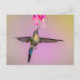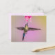 Postal con el exótico colibrí de cola violeta en vuelo en un bosque nublado en Ecuador, llegando a una flor de fucsia rosa, con sus alas estiradas y hermosas plumas largas de cola en exhibición. Hermosa y única tarjeta de colibrí para los amantes de las aves, la naturaleza y el jardín. Foto tomada en Tandayapa, Ecuador.