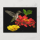 Esta postal contiene un colibrí hembra gaviota. Se atrapa en el aire mientras bebe néctar del centro dorado de una flor de zinnia roja brillante. Cerca hay una flor de zinnia amarilla y algunas hojas verdes completan la composición. Los colores parecen brillar sobre el fondo oscuro.