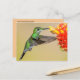 Postal con un magnífico colibrí brillante de corona verde con brillantes plumas verdes iridiscentes alimentadas por un naranja y una flor amarilla junto a una abeja. Hermosa tarjeta para los amantes del colibrí, la naturaleza y el jardín. Foto tomada en Bosque de Paz Reserva Biologica, Valle del Río Toro, Alajuela, Costa Rica.