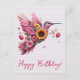 Un colibrí volando cubierto de girasoles rosados, callejones y tulipanes