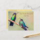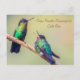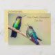 Postal con dos colibríes verdes, naranjas y amarillos con el canto de los higos, una con el pico abierto como si hablara con el otro, en Costa Rica. Foto tomada en Paraiso Quetzal Lodge, San Gerardo de Dota, Costa Rica.