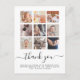 Una hermosa tarjeta de agradecimiento para recién nacido con estilo moderno en forma de cuadrícula y collage de fotos, perfecta para presentar a tu pequeño a tu familia y amigos y agradecerles por el apoyo durante tu embarazo. El diseño moderno cuenta con un collage de 9 fotos cuadradas personalizables. Debajo hay un encabezado de "gracias" en una tipografía caprichosa y elegante, y el nombre y datos de tu bebé, en letra simple. En el reverso está tu mensaje personalizable. A través del botón de "personalización" puedes reemplazar las fotos y cambiar el texto.