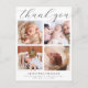 Esta sencilla y elegante plantilla de tarjeta postal de agradecimiento para anunciar el nacimiento de un bebé en la universidad con cuatro fotos presenta un aspecto moderno y elegante en blanco y negro. Cuenta con cuatro de tus fotos favoritas del bebé, un encabezado de "gracias" en caligrafía elegante, y el nombre y datos de tu bebé en una fuente con clase. El reverso presenta tu mensaje personalizado de agradecimiento y un pequeño corazón boho. Utiliza las herramientas de diseño intuitivas, tus fotos favoritas y tu inspiración, y haz de esta tarjeta de agradecimiento de collage minimalista y elegante con varias fotos algo único.