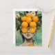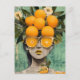Una hermosa mujer con gafas de sol con naranjas en la cabeza al estilo de un collage de medios mixtos