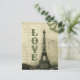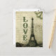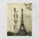 Esta postal de París de inspiración vintage cuenta con una fotografía antigua de la Torre Eiffel en París, Francia. Una antigua carta de amor francesa se desvanece en el fondo, y la palabra "amor" se imprime con letras de tipografía vintage.