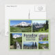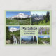 Postal con fotos tomadas en el Paraíso en el Parque Nacional de Mt Rainier. Incluye fotos de Paradise Inn, Myrtle Falls, flores silvestres y vistas de Rainier y la cordillera de Tatoosh.