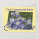 El azul simboliza el cielo; el blanco simboliza la nieve; el amarillo simboliza la historia de las minas de oro de Colorado. Esto hace de la Rocky Mountain Columbine o Colorado Blue Columbine la elección perfecta para la Flor Estatal de Colorado, como fue designada en 1899 luego de un voto de los escolares de Colorado. En 1915, la canción "Where The Columbine's Grow" (Donde crece la columna) fue adoptada como la canción oficial del estado de Colorado. En abril de 1999, un tiroteo atroz y horroroso vinculó para siempre a "Columbine" con una tragedia en este país. Espero explorar el simbolismo de esta hermosa flor, provee una pequeña separación. Los antiguos griegos y romanos atribuyeron esta planta a la diosa del amor, Afrodita. Se cree que la flor, con sus insólitas espuelas, se parece al gorra de un bufón de la corte, dándole crédito a una asociación con "el tonto". En el lenguaje victoriano de las flores, los regalos de Columbines significaban, "resuelto a ganar". Curiosamente, las Columbinas han sido mencionadas o representadas en la religión cristiana durante muchos siglos. Algunos cristianos creían que la flor de Columbine tenía el significado de los Siete Regalos del Espíritu Santo. Entre ellos se contaban la sabiduría, el intelecto, la reverencia o la piedad, la fuerza, el consejo, el conocimiento y el miedo, como en el miedo a Dios o el miedo a hacer mal ante los ojos de Dios. El color de los pétalos también es significativo. Azules y púrpura significan "penitencia". Las espumas de las flores de Columbine (los pétalos alargados que cuelgan debajo de la flor) han evolucionado a diferentes longitudes y anchuras para acomodar a los polinizadores indígenas en el área en la que crecen. Esas espuelas alargadas me recuerdan a las flores de miel, que también tienen espoletas debajo de los pétalos. Las flores SON comestibles y dulces, mientras que las semillas y las raíces son ALTAMENTE tóxicas. Como es difícil determinar qué flores albergan semillas, lo mejor es obtener dulces de fuentes más seguras y confiables. Por supuesto, este diseño no es solo un homenaje a la encantadora y algo exótica flor de Columbine, sino que también rinde homenaje a nuestro 38° estado. Colorado es apodado "El Estado centenario" porque se convirtió en un estado en 1876, el centésimo aniversario de la Declaración de Independencia de Estados Unidos. Aunque Colorado tiene una geografía diversa, el contorno del Estado tiene curiosamente un aspecto cuadrado. Eso es porque, como Wyoming y Utah, las fronteras de Colorado se definieron originalmente en líneas de latitud y longitud. Este encantador diseño ofrece un contorno del estado de Colorado, lleno de su flor estatal, la verdaderamente asombrosa y acertadamente llamada "Colorado Blue Columbine". Estas deliciosas postales pueden ser compradas antes de sus vacaciones para que no pierda tiempo buscando y pueda concentrarse en toda la belleza a su alrededor. Parar con los sellos postales correspondientes para una presentación aún más impresionante.