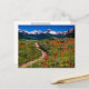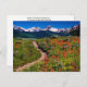 En la parte delantera de esta postal, una variedad de flores silvestres coloridas se mezcla con el predominante rojo vivo del pincel indio. Esta es una escena común en los veranos del alto país de Colorado.