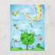 Ilustracion surrealista con colores arcoiris, notas musicales, pájaro y árbol grande.