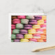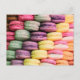 Estas dulces confecciones francesas a base de merengue están llenas de un delicioso centro para crear un delicioso y dulce bocadillo de galletas. Este arcoiris de colores apilado significa diferentes sabores. Colorida tarjeta postal de cocina francesa barata