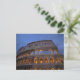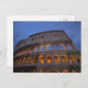 Una impresionante foto del Coliseo Romano que es un monumento antiguo en Roma, Italia. Un interesante ángulo y perspectiva. Disparo por la noche con arcos iluminados y naranja brillante. El cielo tiene nubes turbulentas de color azul oscuro encima.
