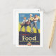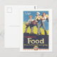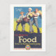 Esta postal es una reproducción de un poster vintage de la Primera Guerra Mundial que dice: "El mundo llora: comida. Mantén el jardín de la casa en marcha". Muestra a dos adolescentes y a un hombre mayor continuando el trabajo de granja/jardín en la frente de casa.
