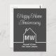 Esta tarjeta postal de Aniversario de Hogar Feliz gris oscuro es simple y sutil con su monograma y el nombre de la compañía de bienes raíces en blanco. Cuenta con un contorno blanco minimalista y elegante de una casa. Tarjetas postales modernas de negocios de bienes raíces para marketing de agentes inmobiliarios para llegar a clientes anteriores.