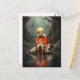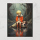 Un niño con una chaqueta roja sentado en una roca por un cuerpo de agua tranquilo y reflexivo, acompañado por su perro. El chico parece triste y su fiel compañero se compadece con él. El lugar está situado en un bosque místico de ambiente tranquilo. Photoshop CS5 de arte digital