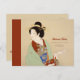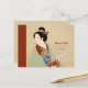 Postal inspirada en una obra de arte delicadamente hermosa del artista japonés Uemura Shōen (1875-1949). La pintura, titulada Composición de un poema (1942), muestra a una mujer hermosa, con kimono y un conjunto de peinados. Está representada en un estilo japonés tradicional. Su cabeza se pone de lado, pero su mirada parece poco enfocada y reflexiva. Pueden imaginar fácilmente que ella está buscando inspiración para un nuevo poema. En sus manos sostiene un bolígrafo y un pedazo de papel. Uemura Shōen (1875-1949) es conocida principalmente por sus pinturas bijin-ga (aprox. pinturas de mujeres hermosas). El concepto a veces fue criticado por ser anticuado y anticuado, pero Uemura Shōen supuestamente dijo que su ambición no era pintar mujeres hermosas, sino hacer pinturas tan hermosas que se las pudiera describir como preciosas gemas, "siempre con un sentido de pureza fresca".