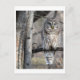 Esta postal muestra una foto de un búho con barras en un árbol.