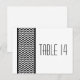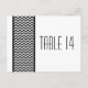 Postal con número de tabla de borde Chevron y moda moderna con un sencillo borde de patrón de chevron en blanco y negro. Este diseño elegante marcará el tono de una boda elegante. Fácil de personalizar, simplemente agregue los números de tabla apropiados en el campo de texto proporcionado. Haga clic en "Personalizar" para encontrar más opciones de personalización.