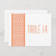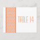 Postal con número de tabla de borde Chevron y moda moderna con un sencillo borde de patrón de chevron en blanco y naranja. Este diseño elegante marcará el tono de una boda elegante. Fácil de personalizar, simplemente agregue los números de tabla apropiados en el campo de texto proporcionado. Haga clic en "Personalizar" para encontrar más opciones de personalización.