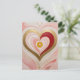 This is an abstract, symmetrical painting centered on a large heart motif that radiates outwards in concentric layers. The color palette is dominated by soft shades of pink and white, creating a gentle, flowing background texture that suggests organic movement or energy fields. The heart is defined by alternating bands of color, prominently featuring luminous gold leaf and a deep, solid red accent on the upper right side. The core of the heart is marked by a bright, yellow circle surrounded by smaller concentric rings. Delicate gold lines outline the major bands, emphasizing the structure and contributing to a sense of luxury and spiritual geometry. The overall composition is harmonious and uplifting.