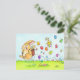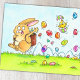 En esta tarjeta, un conejito de Pascua beige salta de derecha a izquierda. Lleva una cesta en la espalda de la que saca huevos de Pascua de todos los colores, que deja caer en la hierba al pasar. De uno de estos huevos, un pollito está saliendo a mitad de vuelo. Parece sorprendido y no demasiado divertido por la situación.
