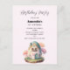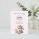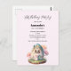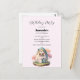 Postal de invitación al cumpleaños con una imagen adorable con un conejito redondo parado afuera de su casa en forma de huevo. Tiene un ambiente kawaii japonés pastel.