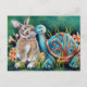 "Race Ya" WatercolorArt Postcard del artista Jean Weiner "Race Ya?" presenta a un joven conejo de cola de algodón oriental investigando e invitando a una tortuga de patio trasero a una carrera! Hermosa conejita, esta tortuga es una estatua de jardín. El carácter caprichoso de esta obra de arte alegra el día de los amantes del conejito.