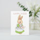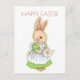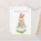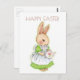 Conejo de conejo con tetera. Tarjeta postal especial para enviar en Pascua a la familia o amigos para las vacaciones o para cualquier ocasión.