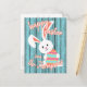 Bonito, moderna y moderna escritura 'Happy Easter' (Pascua feliz) en un resorte luminoso con tablas de madera azul en el fondo y un lindo conejo en la parte superior de las planchas. Con espacio para personalizar o personalización con el nombre de su familia y el texto de su elección en la parte delantera, y un poema o un lindo mensaje de bienvenida personal en la parte trasera.