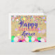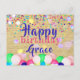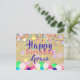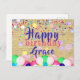 Diseño de tarjeta postal de cumpleaños personalizada con confeti colorido y globos en un fondo de papel viejo. El texto es totalmente personalizable.