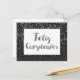 Postal de cumpleaños española moderna con fondo de confeti plateado y negro y Cumpleanos Feliz con un diseño purpurina de plata. Tenga en cuenta que no hay un purpurina real, sino un efecto de diseño purpurina.