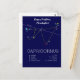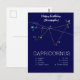 Constelación zodiacal Capricornus o cabra con un cuerno. El color de las estrellas es aproximadamente real. Nombres de estrellas y objetos espaciales. Según uno de los mitos, Capricornus es una criatura que es una mezcla de pez y cabra; el nombre significa "cuerno de cabra" en latín. La historia se desarrolla de la siguiente manera. Baco, el dios del vino, estaba celebrando en las orillas del río Nilo y saltó al río. La parte submarina de él se transformó en un pez, mientras que su cuerpo superior se convirtió en el de una cabra. La buena noticia es que desde su posición Baco vio al gigante Tifón venir a matar a Júpiter. Así que Capricornus tocó sus flautas y Tifón huyó. Júpiter, también conocido como Zeus, colocó la nueva forma de Baco en el cielo como agradecimiento. Capricornus es la constelación del Zodiaco. El Sol transita por el área a lo largo de la línea de la Eclíptica entre el 22 de diciembre y el 19 de enero. Tarjeta postal de felicitaciones de cumpleaños única, elegante, divertida para cualquier persona. Personalizable. Puedes cambiar la imagen y el texto del modelo "Feliz cumpleaños, Christopher!". Puedes transferir este diseño a una variedad de otros productos. Solo elige el producto desde la opción desplazable "Transfer