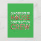 La imagen muestra las palabras "GINGERBREAD HOUSE CONSTRUCTION CREW" escritas en un estilo lúdico y decorativo. Cada carta está diseñada para parecerse a una galleta de pan de jengibre, con detalles de la guinda y elementos decorativos como latas de caramelo y rociadores. El diseño general es festivo y recuerda a la temporada de vacaciones.