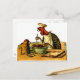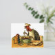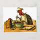 Ilustracion vintage de un pavo en el gorra del chef y mezcla ingredientes mientras lee una receta. Una carta tiene el comienzo de una invitación para una fiesta (estás invitado a un fiesta - estoy cocinando). Esta es muy divertida.
