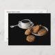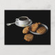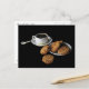 Esta postal le seducirá con un plato de deliciosas galletas de mantequilla de cacahuete y una taza de espresso demitasa completa con cáscara de limón. Las galletas tienen el patrón tradicional de cruz cruzado. La vida quieta se organiza casualmente sobre un fondo negro.