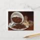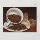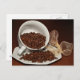 Envíe un saludo con esta fotografía de una taza de café y un platillo blanco con granos de café derramados.