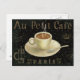 © Daphne Brissonnet / Wild Apple. Una taza caliente de capuchino con un platillo y cucharadita. El fondo negro tiene palabras en francés escritas en él.