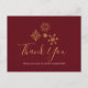 Tarjeta de agradecimiento con una ilustración de copos de nieve dorados con formas cristalinas elegantes. Un fondo rojo oscuro. Mensaje personalizado en el reverso.
