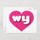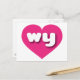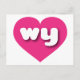 Esta tarjeta postal presenta un vibrante corazón rosa caliente que contiene las letras minúsculas redondeadas, blancas y negritas wy, una abreviatura divertida para Wyoming, el estado vaquero. El reverso de la tarjeta postal está en blanco, esperando su texto personalizado o sentimientos escritos a mano.