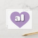 Esta postal presenta un corazón de lavanda fresco, tranquilo y recogido que contiene las letras negrita, blanca, redondeada, funda inferior al, una abreviatura divertida para Alabama, el estado de martillo amarillento. El reverso de la postal está en blanco, esperando el texto personalizado o los sentimientos manuscritos. ¡Marea rodante!