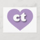 Esta postal presenta un fresco corazón de lavanda que contiene letras negrita, redondeadas, blancas bajas fundas ct, una versión juguetona de la abreviatura de Connecticut, el estado de la constitución. El reverso de la postal está en blanco, esperando el texto personalizado o los sentimientos manuscritos.