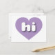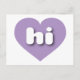 Esta postal presenta un corazón de lavanda con forma y fresco que contiene las letras negrita, blanca, redondeada de funda inferior hi, una abreviatura juguetona para Hawaii, el estado de aloha. El reverso de la postal está en blanco, esperando el texto personalizado o los sentimientos manuscritos.